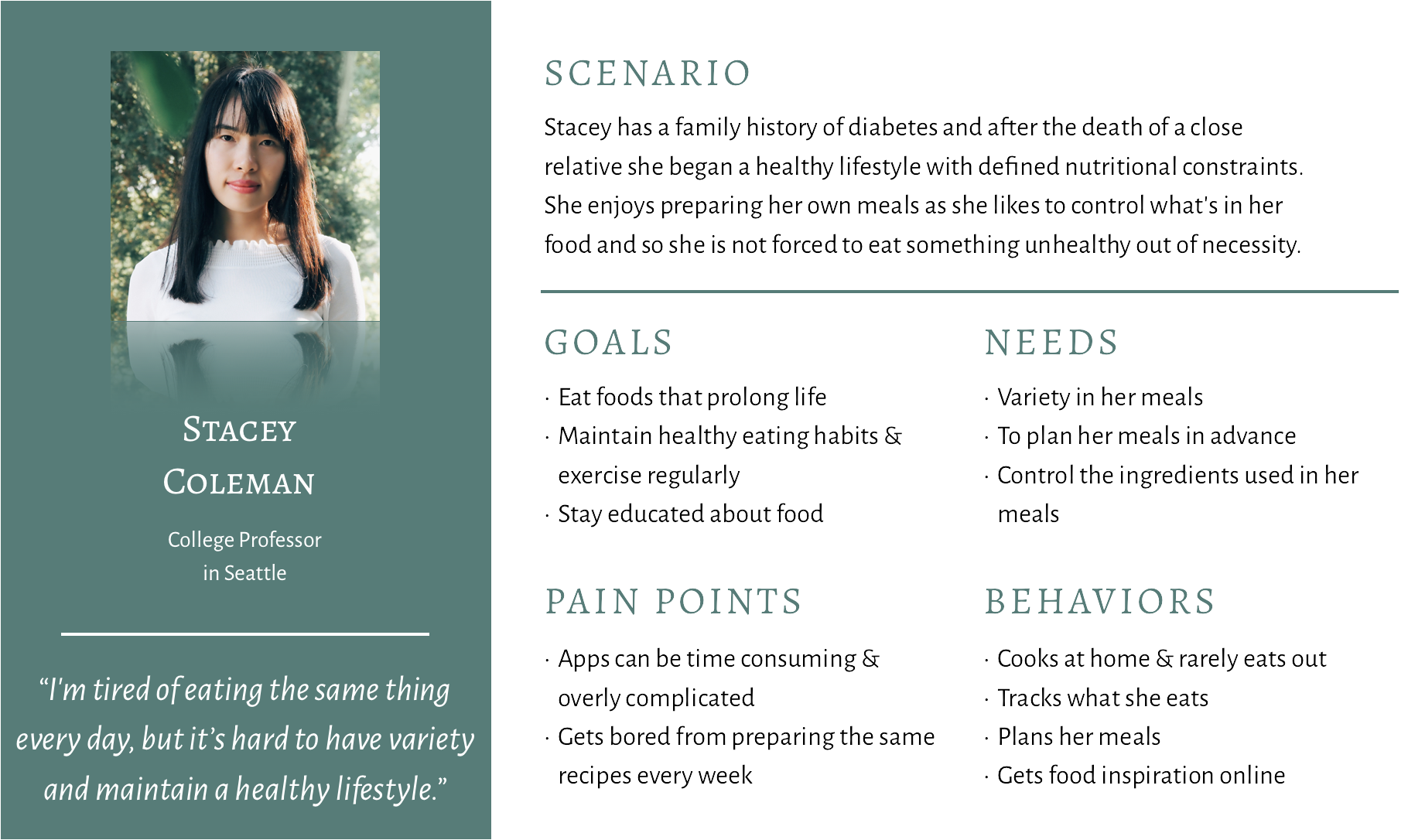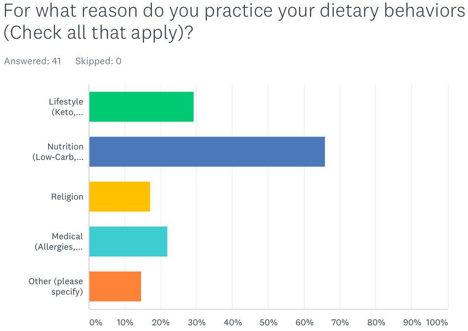Cross-referencing those who selected nutrition as the main reason for their dietary behavior and those who felt those behaviors affected their daily life moderately to very much we had 24 viable candidates. We selected and interviewed 5 users of diverse backgrounds. Making sure to include not only those who selected nutrition as their main dietary behavior but also those who selected a secondary reason for these behaviors as well.