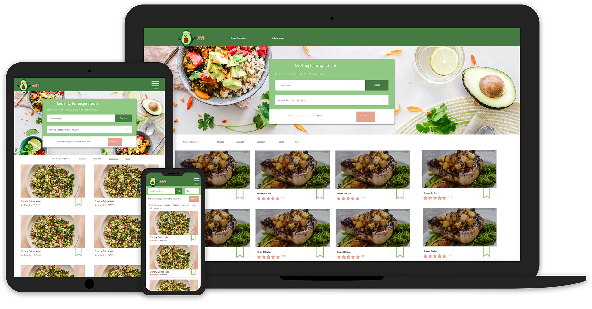 It was time to hand our designs off to the software engineering team to start development on our site. Final adjustments were made to the design based on feedback from our users, as well as, input and the availability schedule of our SE team. A 3rd breakpoint was added so that users would enjoy their experience across all devices. A healthy food recipe API was used to populate the information on our site to give it full functionality.