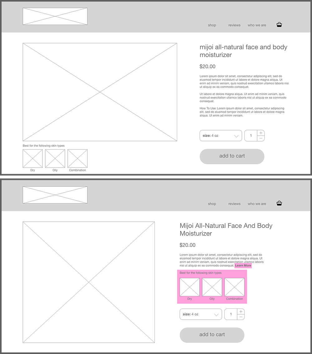 Through user testing and a design review with Mijoi, I received valuable feedback on the mid-fi wireframes that would help strengthen the final design. Areas of improvement would include the revised placement of the skin/hair indicators, replacement of the secondary purchasing option, a larger hero image, and rethinking how we highlight ingredients.